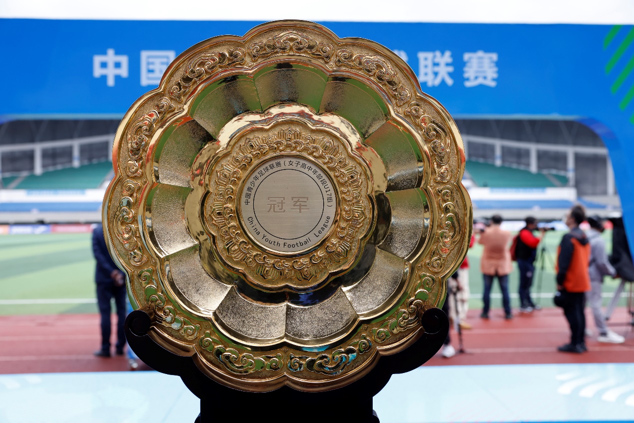 事实上,中国青少年足球联赛冠军奖杯没少花费主办者心血。男子奖杯造型取自中国传统的青铜双耳杯,双耳上錾刻云纹,寓意高升、吉祥如意,飘逸的形象象征青少年的生机和活力。下部由11根龙纹高足环抱,象征11位青少年球员同心同德共赴美好未来,同时也突显了赛事的团结与融合。而此前在江西于都赛区颁发的女子组奖盘造型取自中国传统的葵形镜,11瓣葵花象征11名青少年女子球员,寓意光辉和圆满,彰显了青少年足球的希望与荣光。