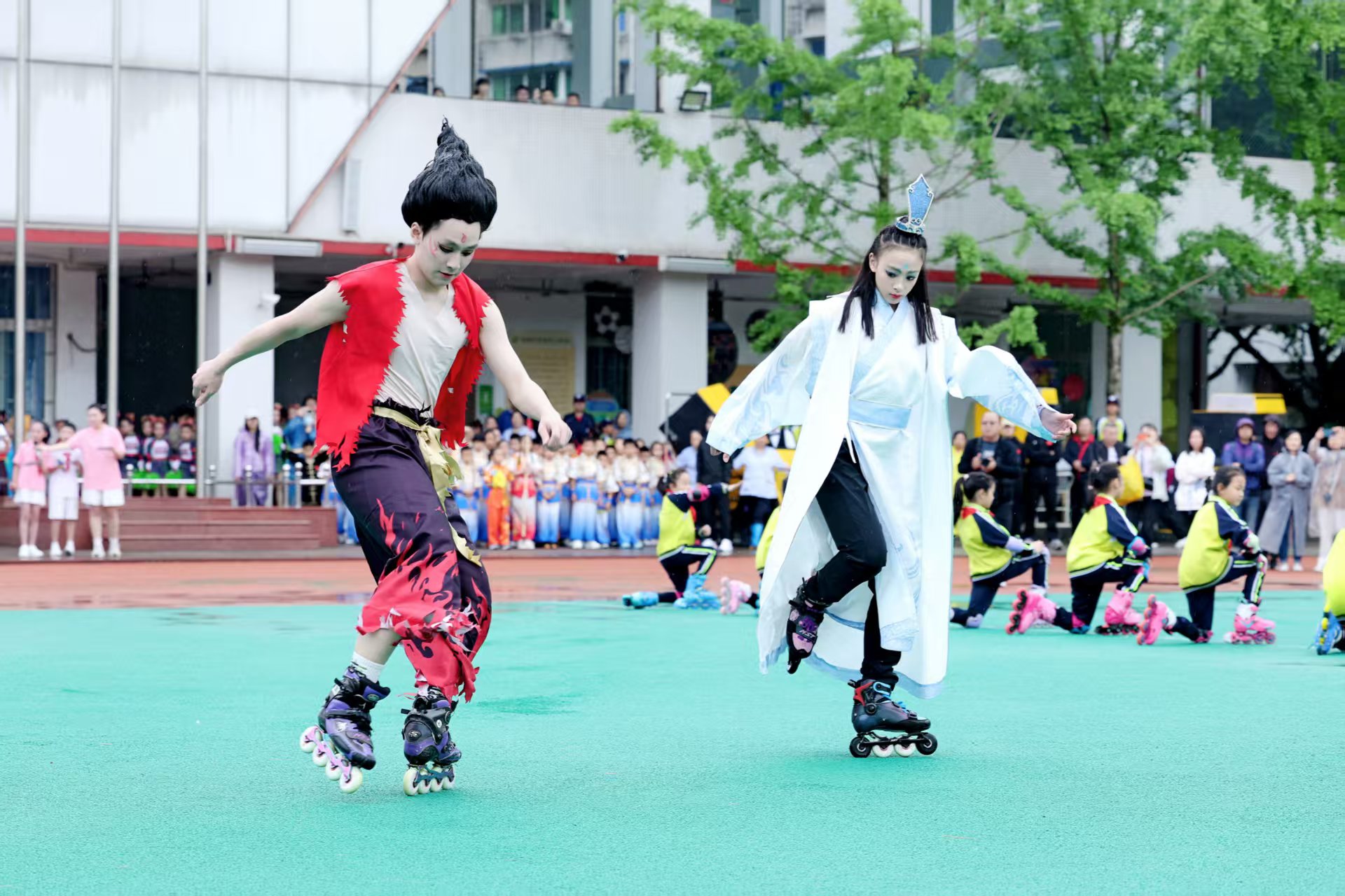 在轮滑表演中,世界锦标赛、亚运会轮滑冠军朱思怡以及世界锦标赛轮滑花式绕桩世界冠军顾琨琦惊艳亮相,他们分别打扮成敖丙和哪吒的形象,脚踏“风火轮”,在赛道上风驰电掣。紧随两位世界冠军出场的是茶店子小学党委书记李强,他同样穿着轮滑鞋,在58岁的年纪用这样的方式给学生们带来惊喜。在接受记者采访时,李强表示:“我其实刚刚接触轮滑运动不久,希望能在今年学校的体育节开幕式上给孩子们一个惊喜。今年体育节开幕式的主题是‘爱成都、迎世运’,所以我选择了成都世运会的竞赛项目轮滑来进行练习,想让孩子们感受到运动是不分年龄的。希望通过开幕式上的精彩节目,让孩子们认识世运会、了解世运会,去培育他们的体育精神,让他们能够不怕困难,不惧风雨。”