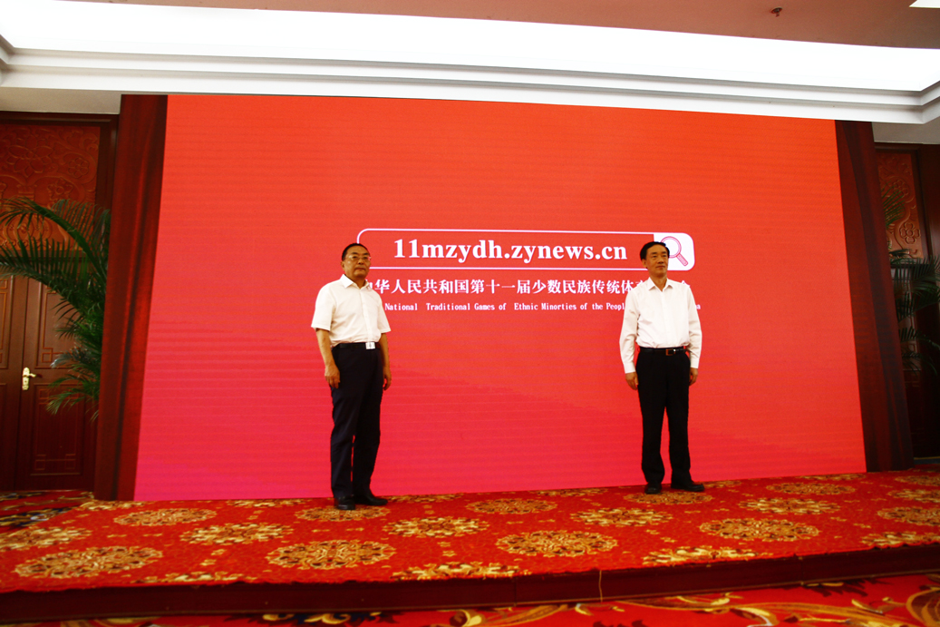 发布会上,相关负责人介绍了运动会筹备情况,运动会官方网站、会徽、吉祥物、宣传画、主题歌也正式对外发布。国家民委副主任李昌平(左),河南省人民政府副省长、运动会筹委会副主任戴柏华(右)在发布会上共同启动运动会官方网站上线。