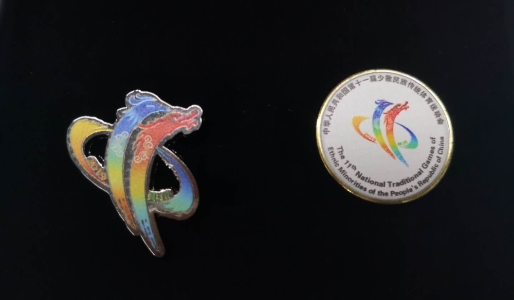 本届运动会会徽主体图形由腾飞向上的龙、凤及两侧的色带组成:龙凤形似阿拉伯数字“11”,恰为本届运动会的届次,又寓有“龙凤呈祥”之意;两侧旋转成半圆的橙色与蓝绿色的色带分别代表着黄河与长江,寓意天南地北各民族的团结凝聚。