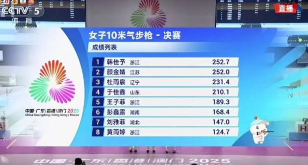 女子10米气步枪个人决赛门票争夺激烈,晋级线达到633.9环,超过了今年4站世界杯该项目晋级门槛。湖北选手刘雅菲以635.5环排名预赛第一,韩佳予以634.7环排名第三挺进决赛,同样晋级的还有巴黎奥运会该项目亚军黄雨婷、今年世界杯该项目“三冠王”王子菲、现女子10米气步枪世界纪录保持者彭鑫露等选手。8名决赛选手全部为“00后”,其中6人为“05后”。韩佳予决赛开局良好,在第17、18发射击不佳后及时调整,成功跻身金牌争夺战。最后两发射击,韩佳予打出10.5环、10.6环,反超江苏选手颜金婧,以252.7环摘得金牌。颜金婧、辽宁选手杜雨宸分获亚军、季军。