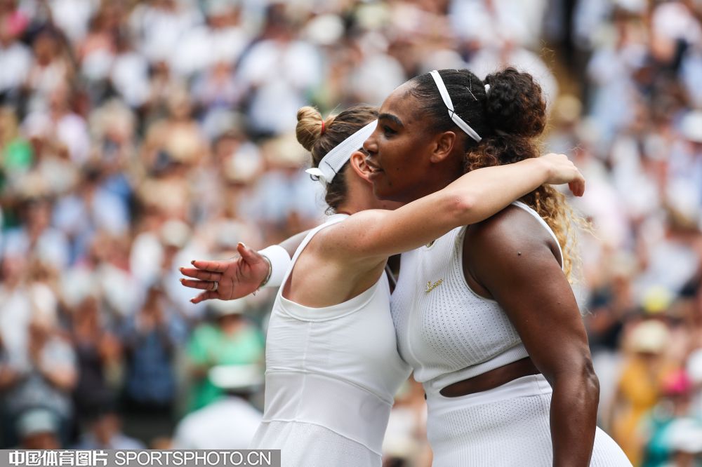 北京时间7月13日晚,2019温网结束女单决赛争夺,罗马尼亚选手哈勒普以两个6比2击败曾八次夺冠的美国选手小威廉姆斯,继去年法网夺冠后第二次赢得大满贯赛事女单冠军。图为哈勒普(左)和小威廉姆斯拥抱。