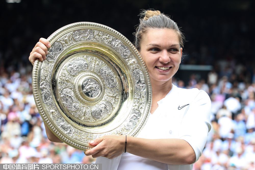 北京时间7月13日晚,2019温网结束女单决赛争夺,罗马尼亚选手哈勒普以两个6比2击败曾八次夺冠的美国选手小威廉姆斯,继去年法网夺冠后第二次赢得大满贯赛事女单冠军。图为哈勒普展示冠军奖盘。