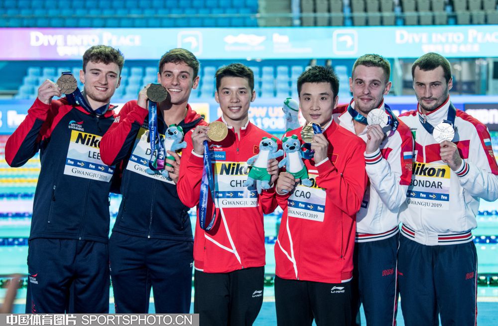 当地时间7月15日,在韩国光州举行的2019年国际泳联世锦赛进入第四比赛日,跳水项目比赛继续在南部大学市立国际游泳馆进行。在男子双人10米台决赛中,中国组合曹缘/陈艾森以486.93分的成绩夺得金牌。图为颁奖仪式现场。