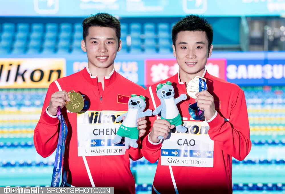 当地时间7月15日,在韩国光州举行的2019年国际泳联世锦赛进入第四比赛日,跳水项目比赛继续在南部大学市立国际游泳馆进行。在男子双人10米台决赛中,中国组合曹缘/陈艾森以486.93分的成绩夺得金牌。图为曹缘、陈艾森(左)在颁奖仪式上。