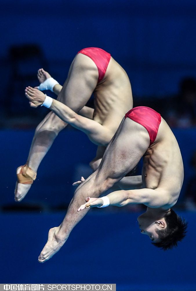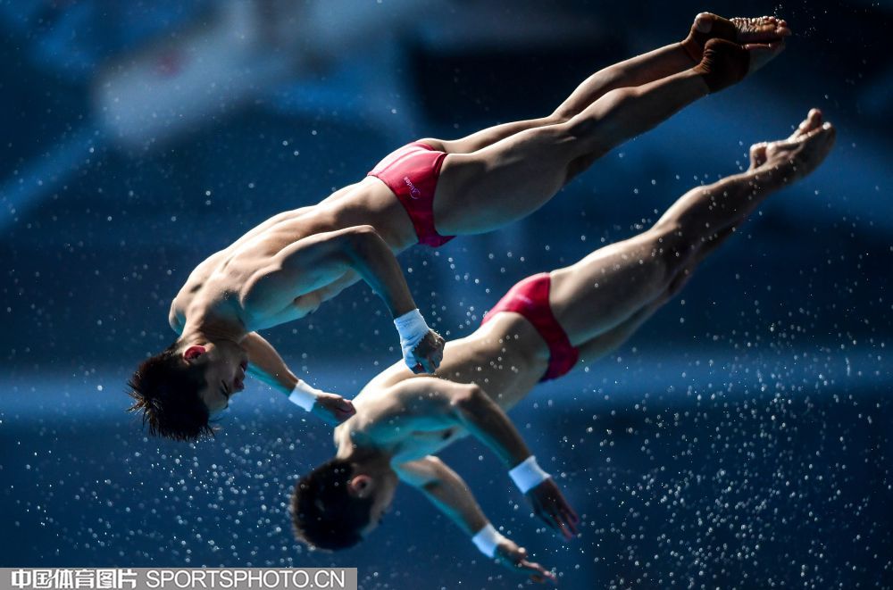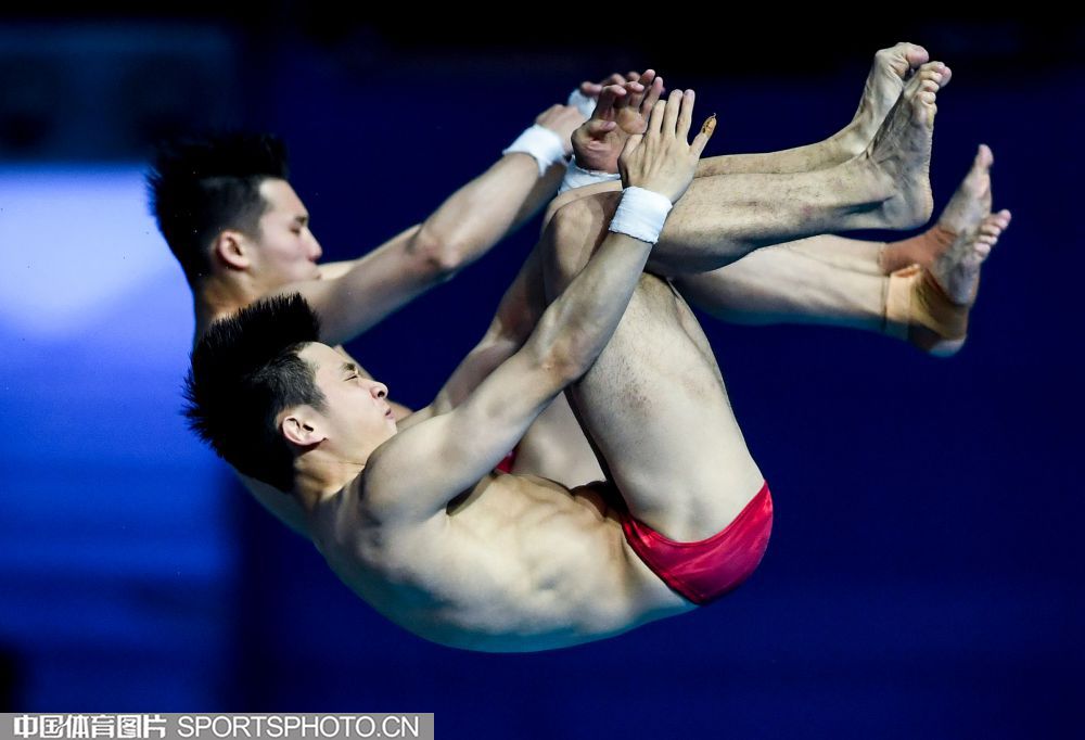 当地时间7月15日,在韩国光州举行的2019年国际泳联世锦赛进入第四比赛日,跳水项目比赛继续在南部大学市立国际游泳馆进行。在男子双人10米台决赛中,中国组合曹缘/陈艾森以486.93分的成绩夺得金牌。图为曹缘/陈艾森在决赛中。