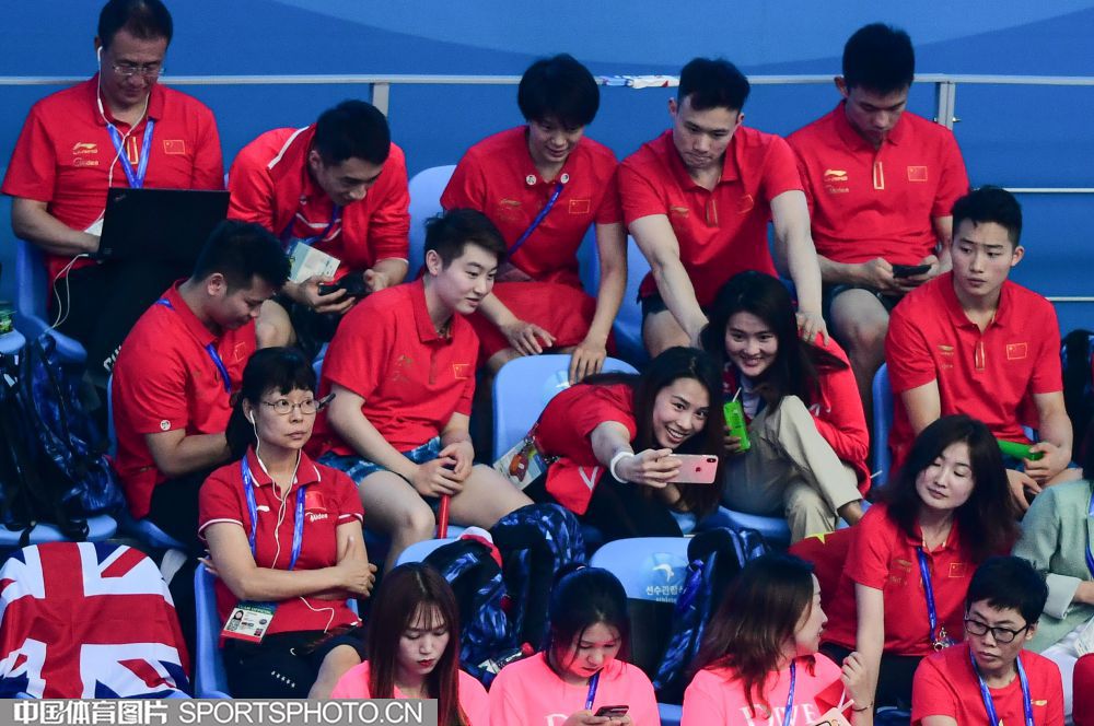当地时间7月15日,在韩国光州举行的2019年国际泳联世锦赛进入第四比赛日,跳水项目比赛继续在南部大学市立国际游泳馆进行。在男子双人10米台决赛中,中国组合曹缘/陈艾森以486.93分的成绩夺得金牌。图为中国跳水队成员在看台上观看比赛。