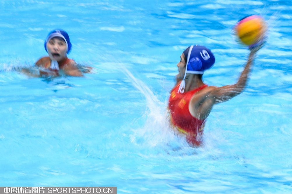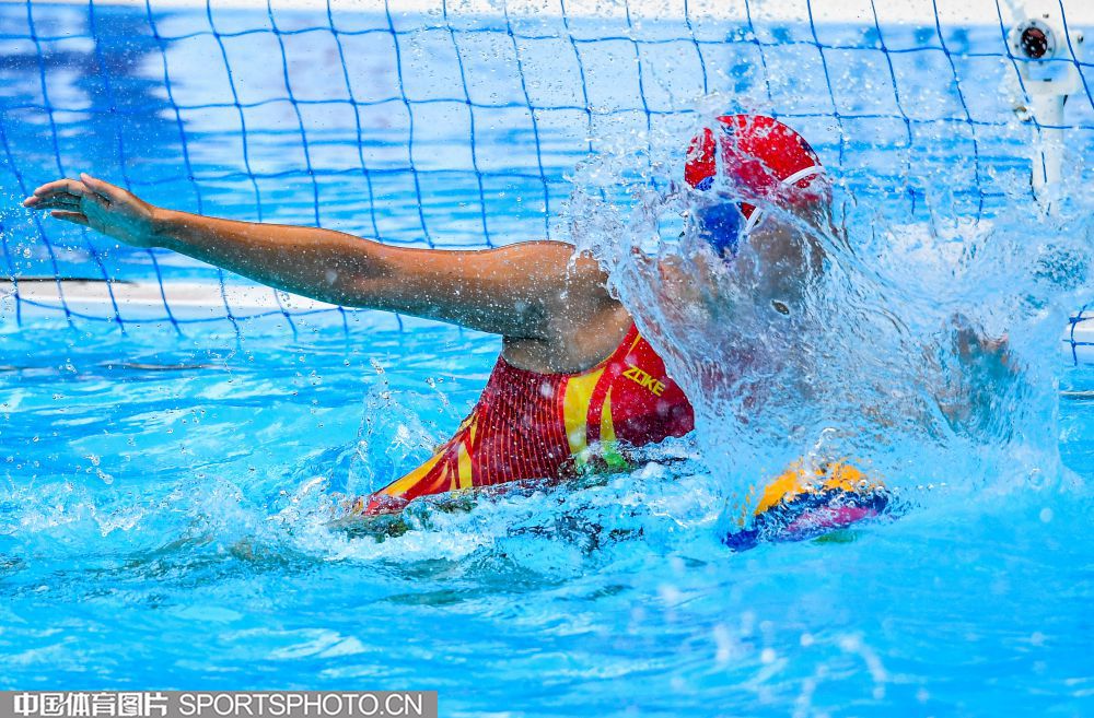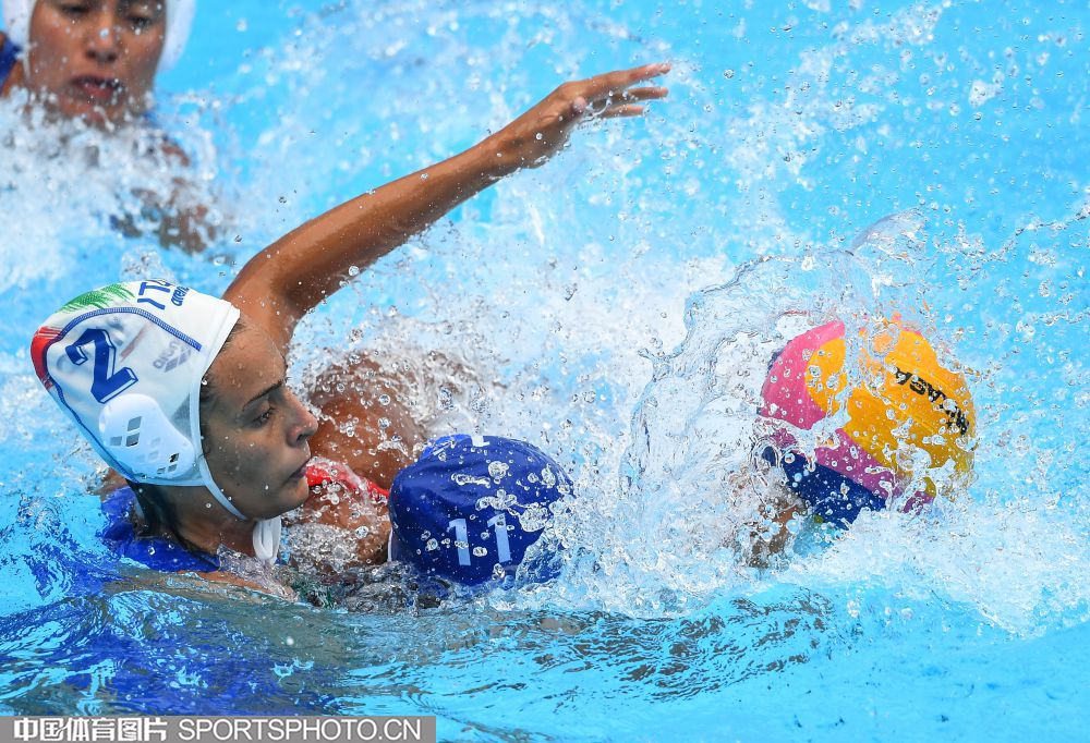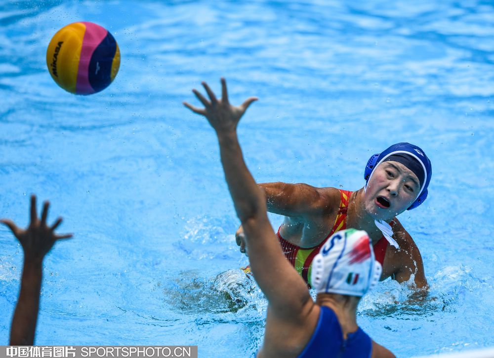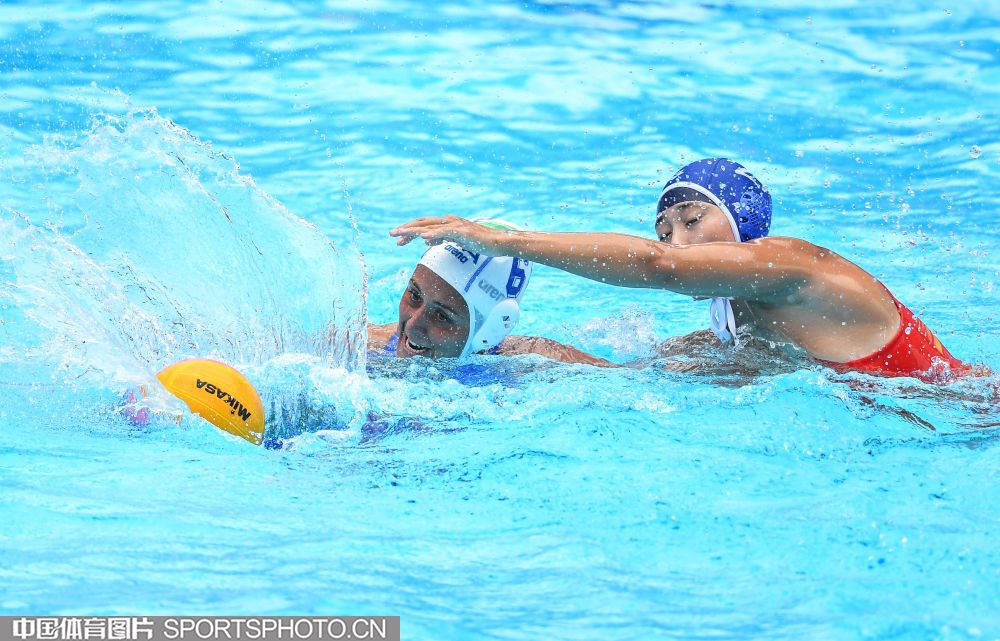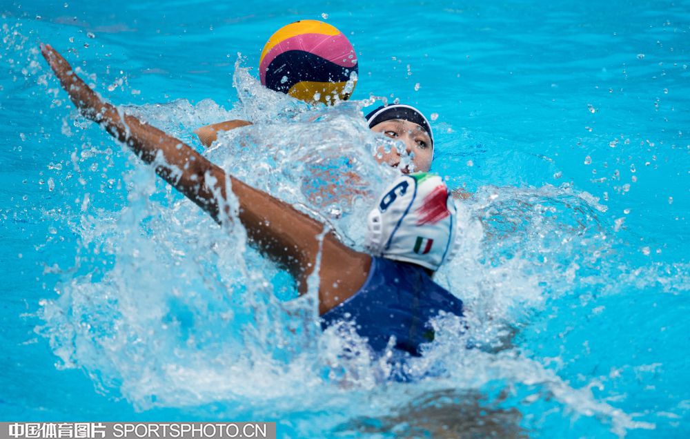 7月16日,第18届国际泳联世锦赛继续在韩国光州举行。女子水球D组最后一轮比赛在南部大学水球场进行,中国队以6比14负于意大利队。图为比赛现场。