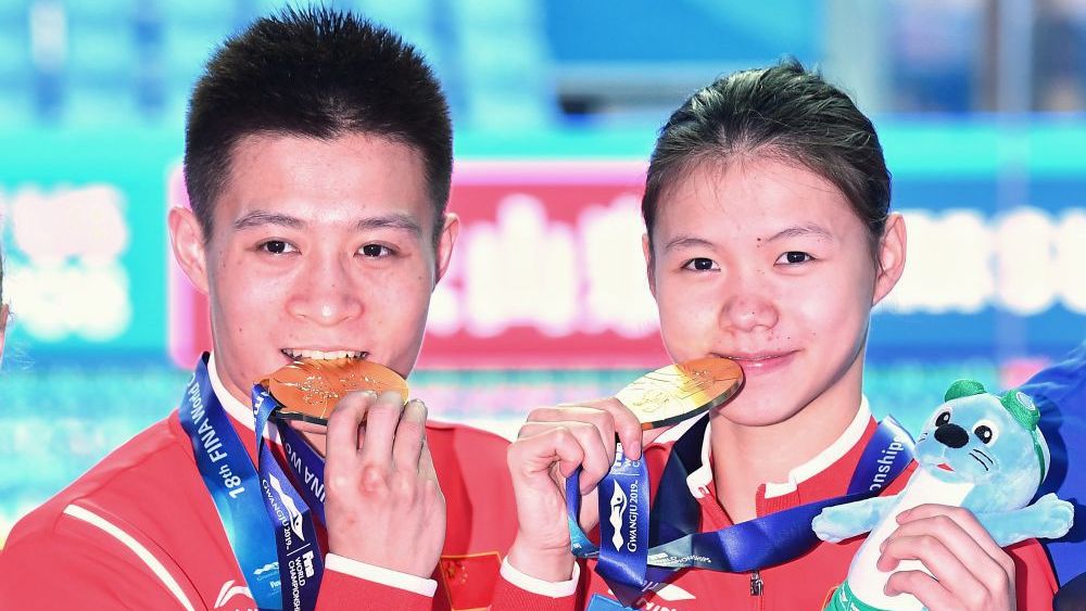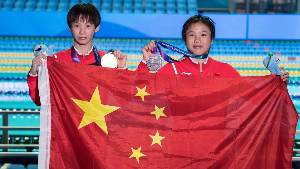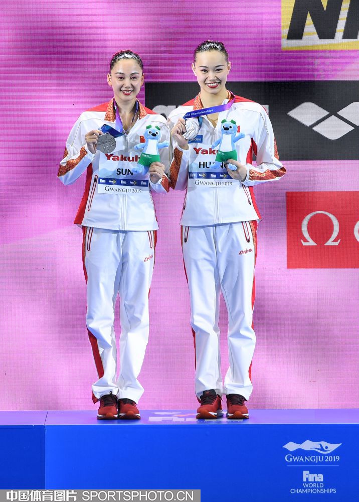 2019年7月18日,2019年国际泳联世锦赛在韩国光州进入第七比赛日,花样游泳比赛继续在念珠综合体育馆进行,在双人自由自选决赛中,中国组合黄雪辰/孙文雁以95.7667的成绩获得亚军。图为黄雪辰、孙文雁(左)在颁奖仪式上。