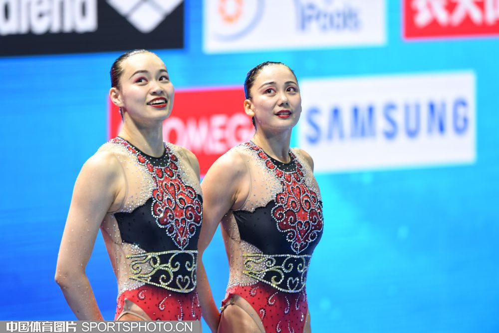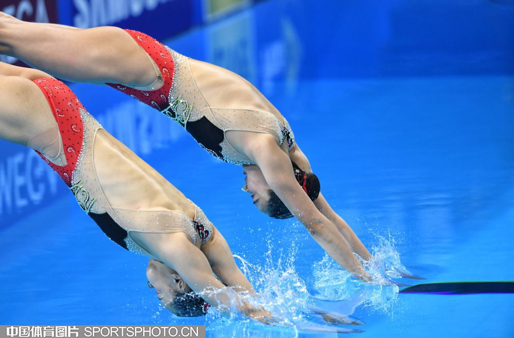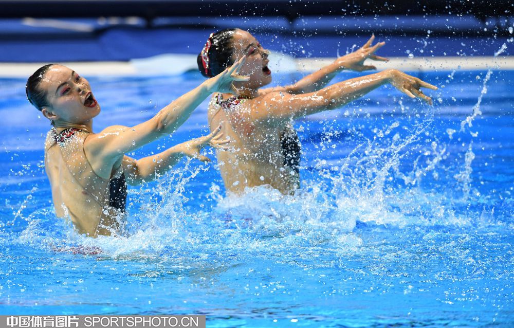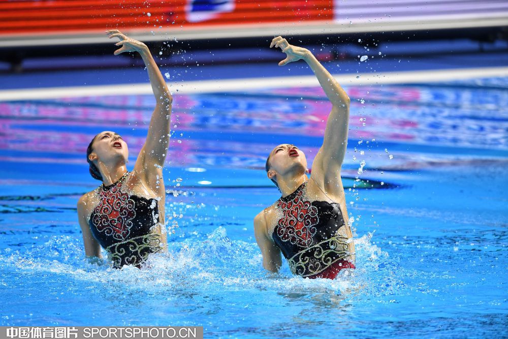2019年7月18日,2019年国际泳联世锦赛在韩国光州进入第七比赛日,花样游泳比赛继续在念珠综合体育馆进行,在双人自由自选决赛中,中国组合黄雪辰/孙文雁以95.7667的成绩获得亚军。图为黄雪辰、孙文雁(右)在决赛中。