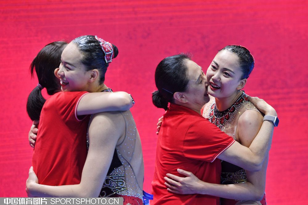 2019年7月18日,2019年国际泳联世锦赛在韩国光州进入第七比赛日,花样游泳比赛继续在念珠综合体育馆进行,在双人自由自选决赛中,中国组合黄雪辰/孙文雁以95.7667的成绩获得亚军。图为黄雪辰(左二)与教练拥抱,孙文雁(右)与中国花游队教练组组长汪洁拥抱。