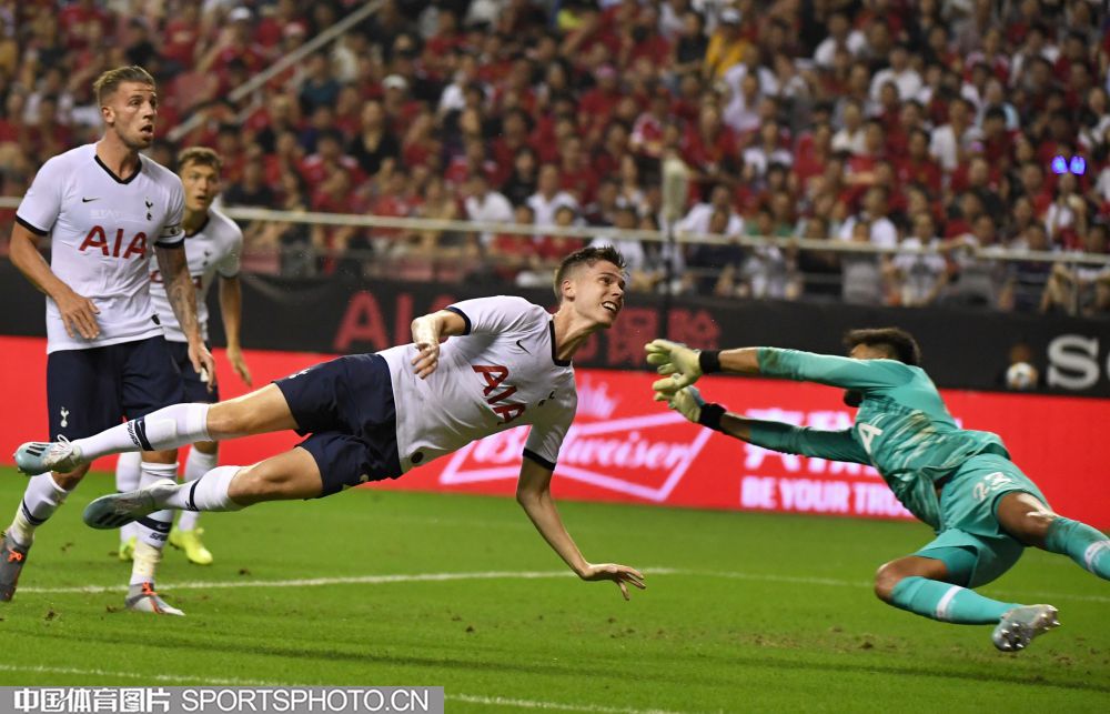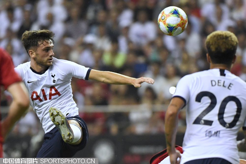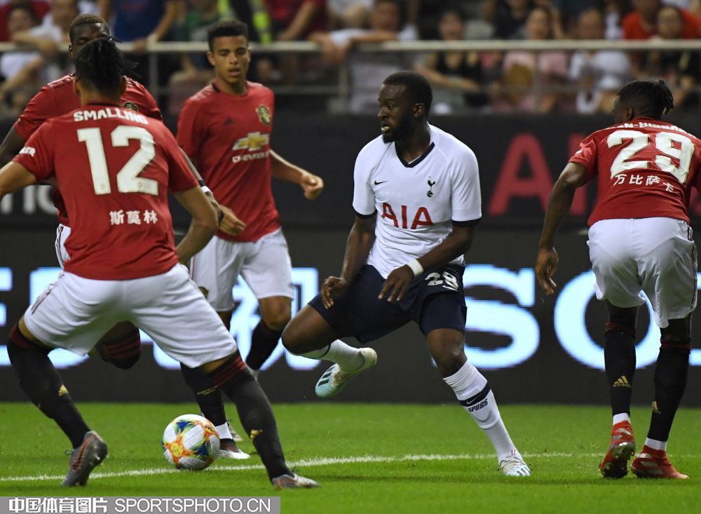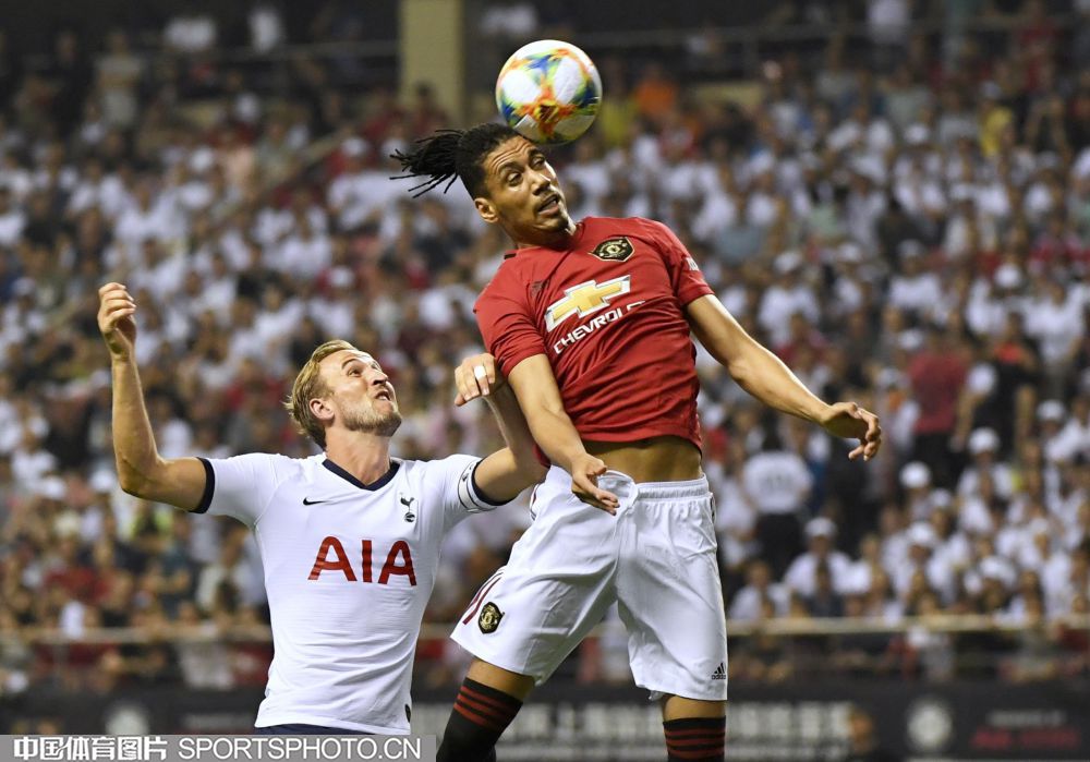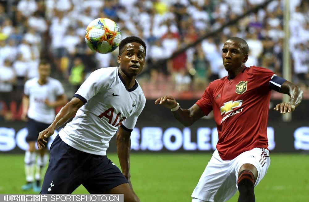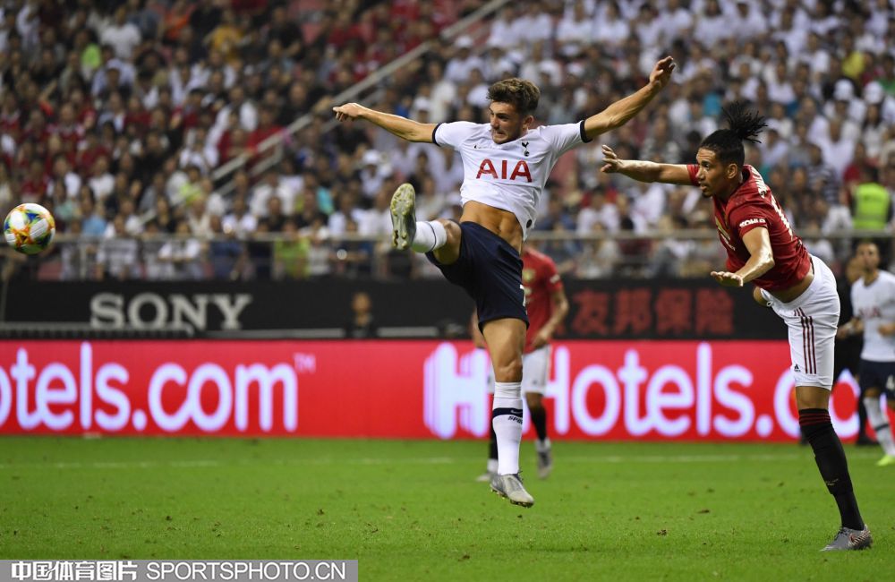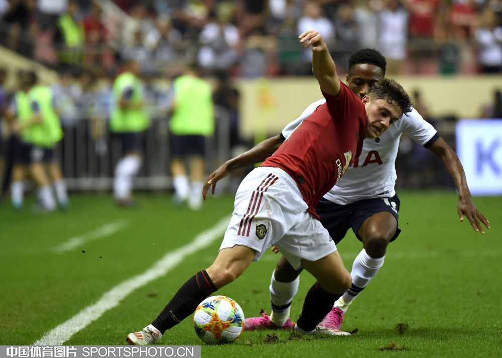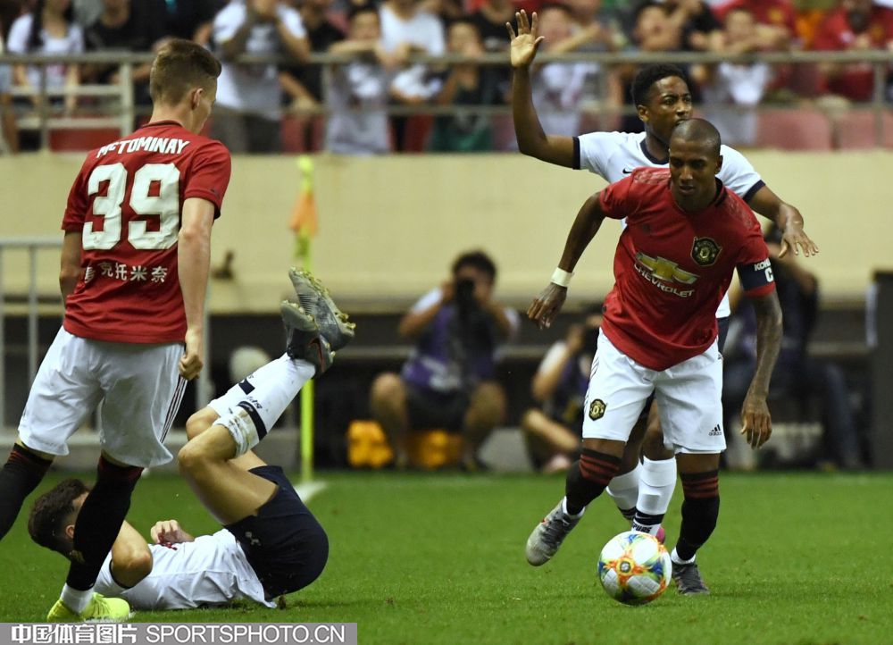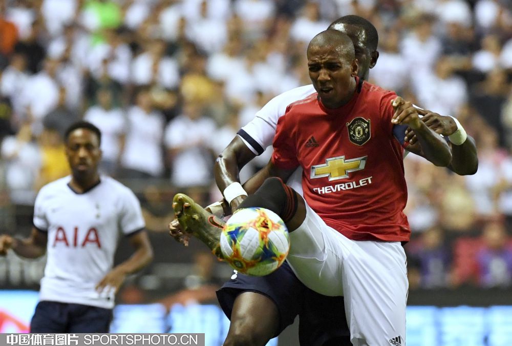 北京时间7月25日晚,2019年国际冠军杯中国站第二场较量在上海打响,对阵双方是英超豪门曼联(红衣)和热刺(白衣),最终曼联2比1取胜。图为比赛现场。