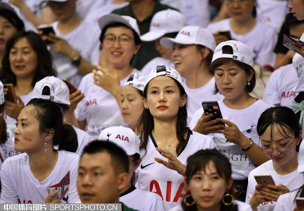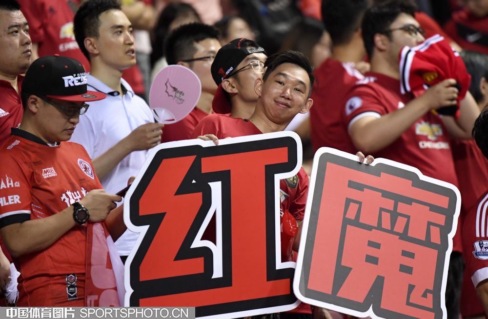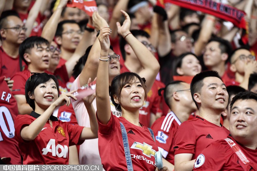 北京时间7月25日晚,2019年国际冠军杯中国站第二场较量在上海打响,对阵双方是英超豪门曼联(红衣)和热刺(白衣),最终曼联2比1取胜。图为现场观众。