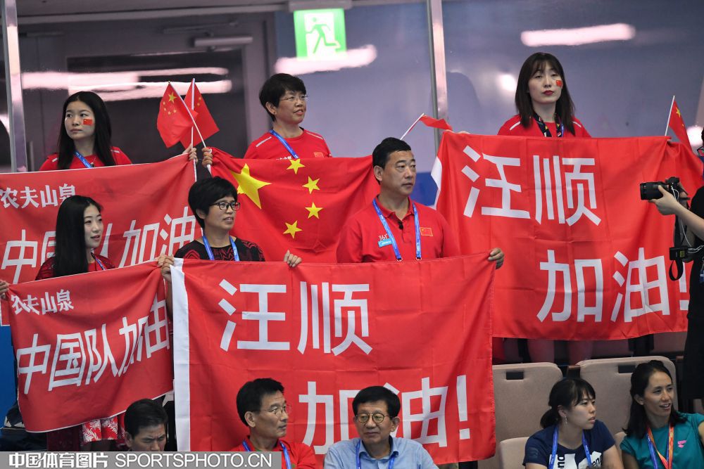 7月25日,2019年国际泳联世锦赛在韩国光州继续进行。中国选手汪顺在男子200米混合泳决赛的比赛中,以1分56秒97的成绩获得第六,日本名将濑户大也以1分56秒14的成绩获得冠军。图为现场观众。