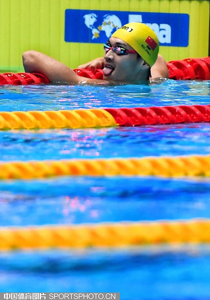 韩国当地时间7月27日,2019年国际泳联世锦赛进入倒数第二个比赛日,中国选手徐嘉余在男子50米仰泳半决赛中位列第六,顺利晋级决赛。图为比赛结束后徐嘉余确认成绩。