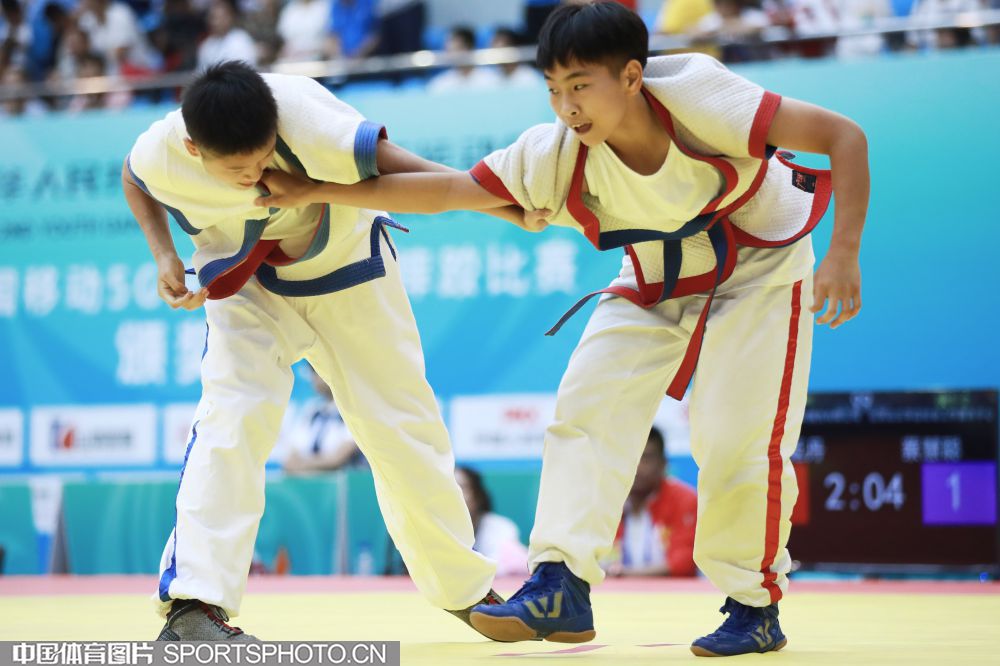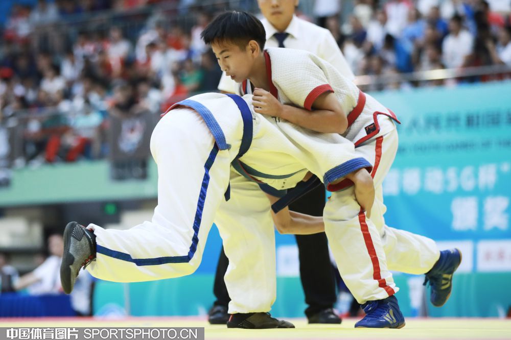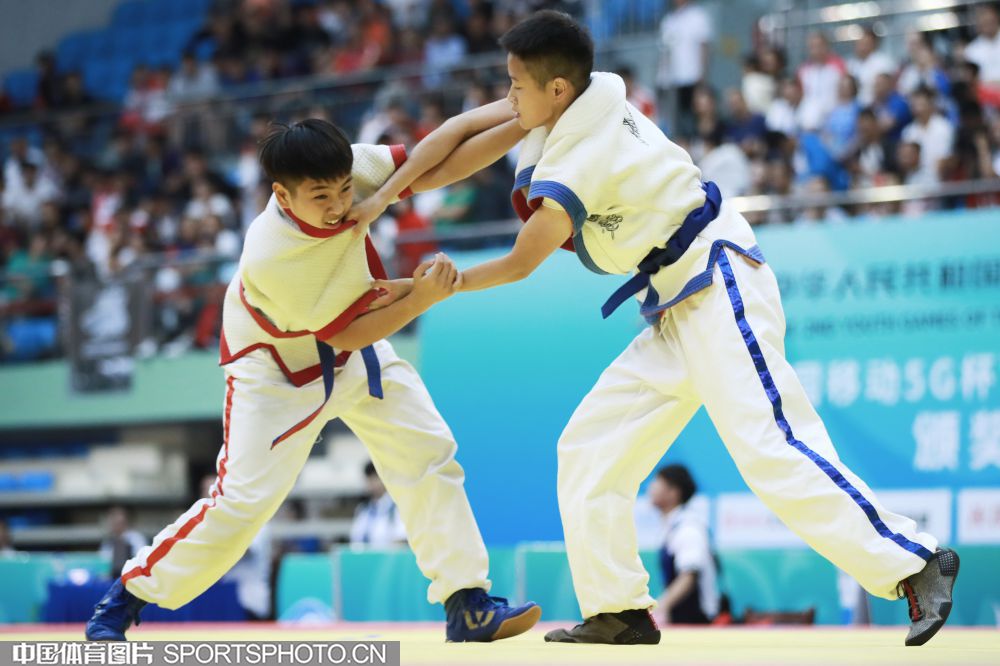 8月4日,中华人民共和国第二届青年运动会中国式摔跤比赛在陕西省忻州市代县体育馆进入第二比赛日。在女子乙组44公斤级决赛中,蔡慧聪战胜孙延丹夺冠。图为蔡慧聪(左)与孙延丹在决赛中。