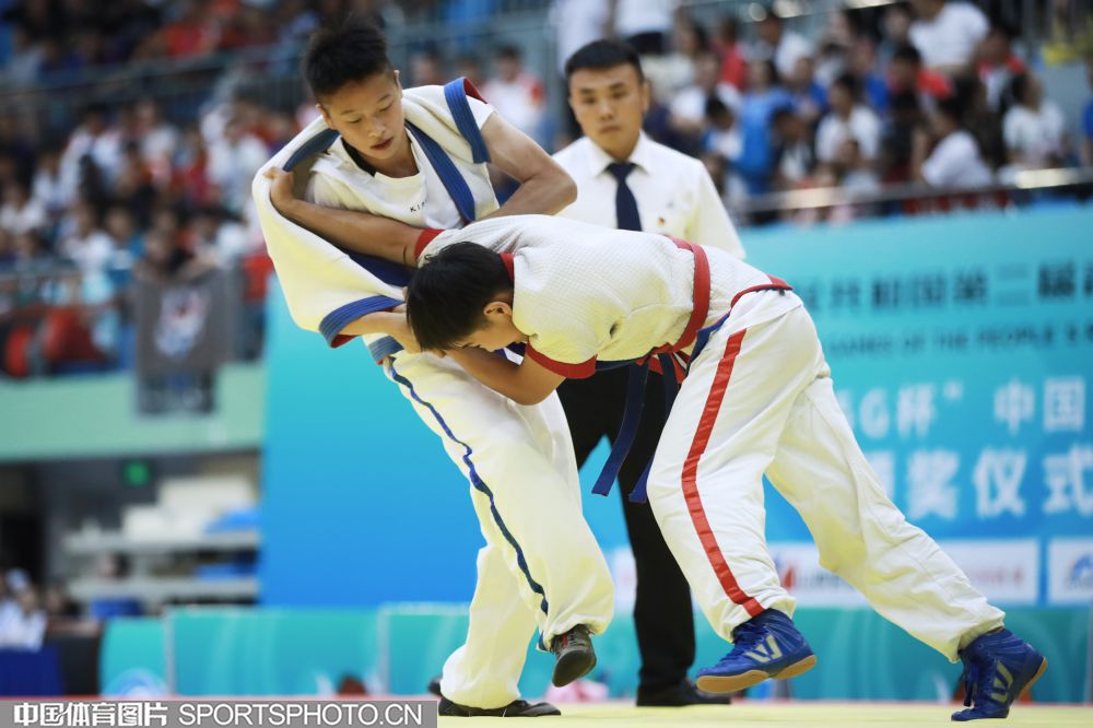 8月4日,中华人民共和国第二届青年运动会中国式摔跤比赛在陕西省忻州市代县体育馆进入第二比赛日。在女子乙组44公斤级决赛中,蔡慧聪战胜孙延丹夺冠。图为蔡慧聪(右)与孙延丹在决赛中。