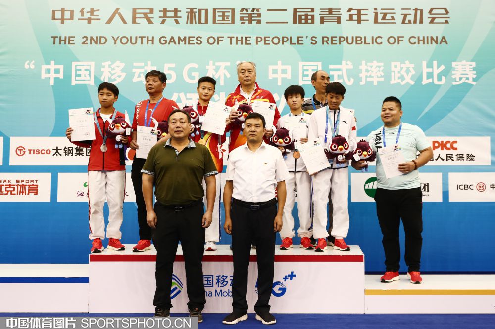 8月4日,中华人民共和国第二届青年运动会中国式摔跤比赛在陕西省忻州市代县体育馆进入第二比赛日。在女子乙组44公斤级决赛中,蔡慧聪战胜孙延丹夺冠。图为赛后颁奖仪式。