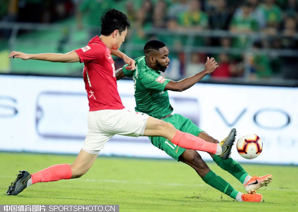 8月11日,2019赛季中国足球协会超级联赛继续第23轮争夺。在北京工人体育场,主场作战的北京中赫国安队(绿衣)以1比3负于广州恒大淘宝队(红衣)。图为巴坎布边路传中。