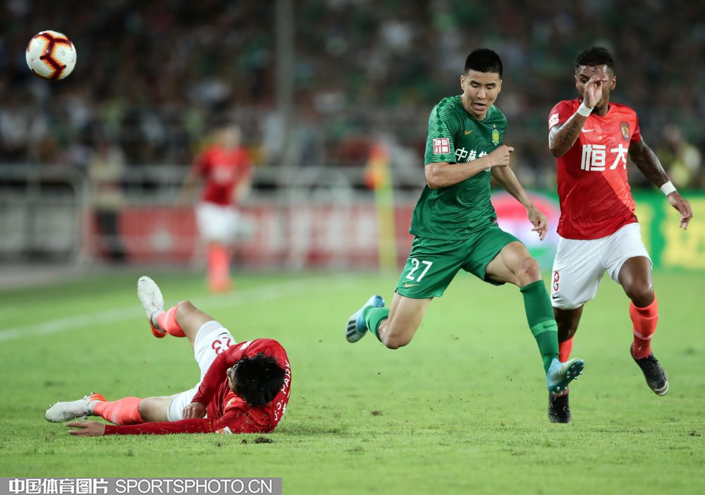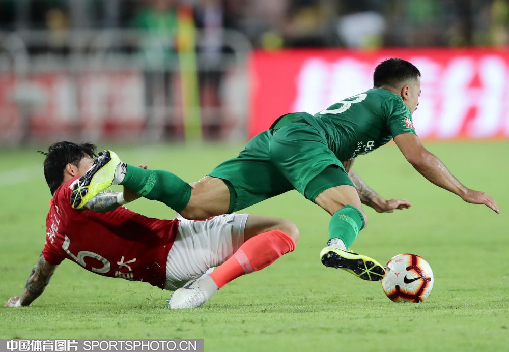 8月11日,2019赛季中国足球协会超级联赛继续第23轮争夺。在北京工人体育场,主场作战的北京中赫国安队(绿衣)以1比3负于广州恒大淘宝队(红衣)。图为张琳芃放倒李可。