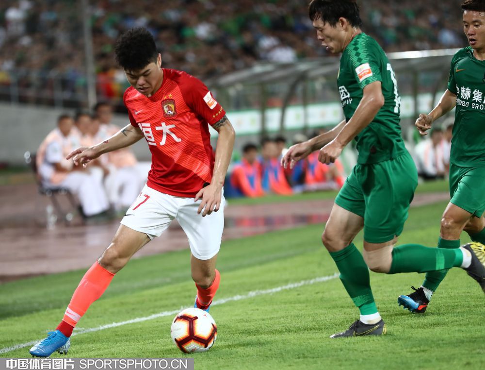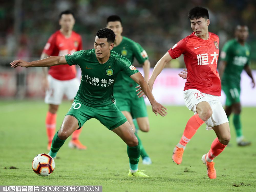 8月11日,2019赛季中国足球协会超级联赛继续第23轮争夺。在北京工人体育场,主场作战的北京中赫国安队(绿衣)以1比3负于广州恒大淘宝队(红衣)。图为王子铭控球。
