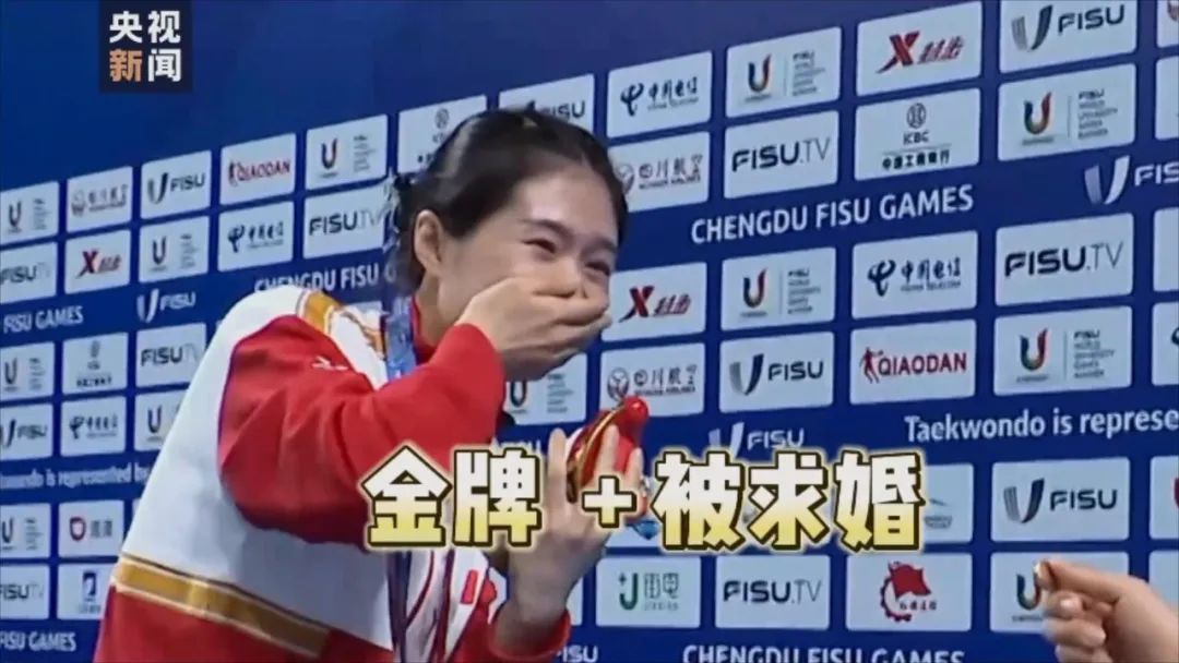 成都第31届世界大学生夏季运动会的赛场激战正酣,优秀选手竞相争金夺银好不热闹,除了这扣人心弦的赛场角逐外,也常有感人的温情时刻。中央广播电视总台央视新闻7月31日发布的短视频《双喜临门!大运会夺冠现场的求婚甜度超标》,在短短的42秒时长中极尽巧思,一经发布便爆火网络。这则短视频在叙事视角由“国”到“家”、音乐节奏由“快”变“缓”、镜头语言由“远”推“近”的同时,更兼具了联结屏幕内外的情感共鸣。短视频通过“在场”到“共在”的超越性构思,呈现了一幕甜度爆表的“赛后求婚时刻”。