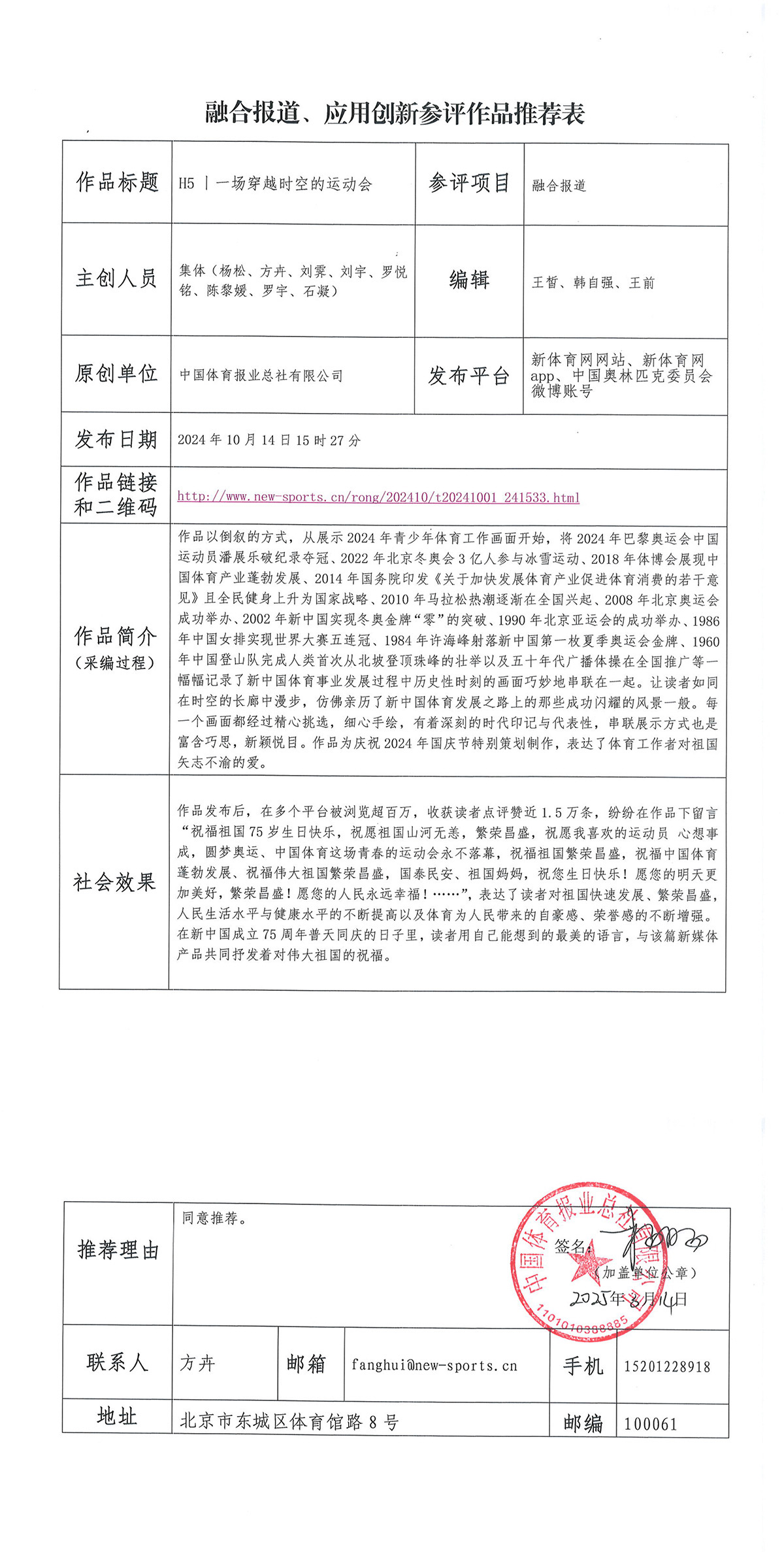 参照中国行业报协会《关于举办全国行业好新闻大赛的通知》及《全国行业好新闻大赛融合报道、应用创新作品评选办法》,我单位拟推荐融合报道《中国体育天团金牌画卷》《H5丨一场穿越时空的运动会》等2幅作品参评全国行业好新闻大赛融合报道作品评选。