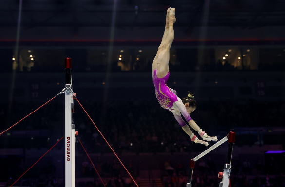↑韦筱圆在利物浦体操世锦赛高低杠比赛中