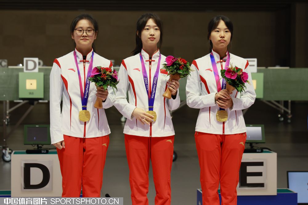 ↑由王芝琳、韩佳予、黄雨婷组成的中国队夺得金牌,成绩为1896.6环。图为(左起)韩佳予、黄雨婷、王芝琳在颁奖仪式上。