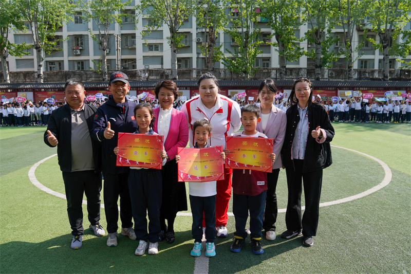在“冠军体育课”上,李雯雯带领二年级全体学生进行趣味热身运动。孩子们兴奋地模仿她的训练动作,欢声笑语中大家学到了专业的运动知识。随后,李雯雯为“二年级班班迎面接力对抗赛”鸣枪发令,并寄语小选手们“比出风采、赛出水平”。