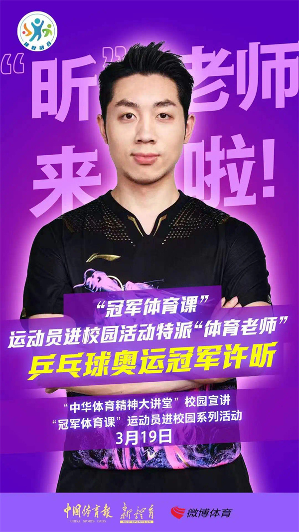 3月19日上午,“中华体育精神大讲堂”校园宣讲和“冠军体育课”运动员进校园活动走进北京市东城区史家小学分校。乒乓球世界冠军许昕、陈幸同将与约1700名在校学生分享各自成长中的励志故事,生动阐释中华体育精神的深刻内涵,一起“切磋”球技,为孩子们带来一堂“精神”和“体魄”双育的体育课。