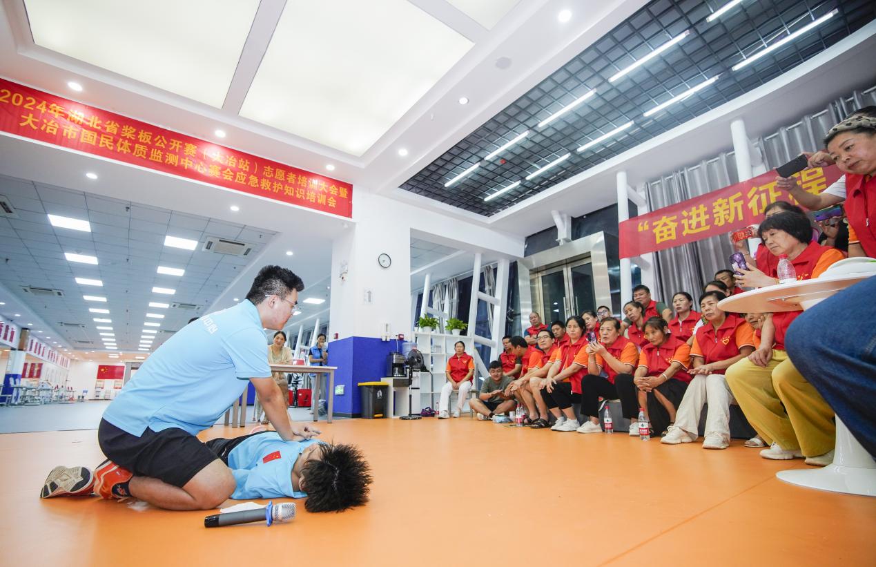 作为2024年湖北省桨板公开赛的首站赛事,赛事主办方通过全方位、多角度的筹备工作,为赛事赋能。赛事组委会主办方在赛前组织开展了“2024年湖北省桨板公开赛(大冶站)志愿者培训大会暨大冶市国民体质监测中心赛会应急救护知识培训会”,共有30余名志愿者参加了培训。培训会上,赛事志愿服务培训讲师白婷就赛事志愿服务工作内容、服务标准、注意事项等内容展开介绍;大冶市国民体质监测中心培训讲师王浩威详细阐述了运动急救的重要性,并在现场进行了AED自动体外除颤器的模拟教学以及心肺复苏步骤教学,让赛事志愿者了解并掌握关键时刻的“黄金四分钟”。