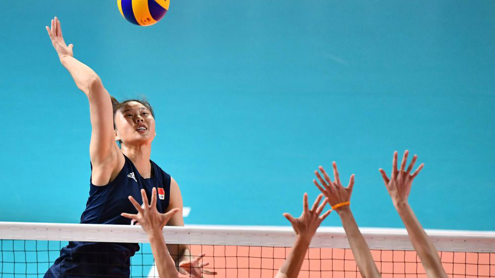 2018年9月1日,第18届亚运会女子排球决赛在雅加达苏嘉诺体育中心排球馆举行。中国队(深蓝色球衣)以3比0(25:19,25:17和25:13)战胜泰国队,开赛以来未失一局,摘得金牌。图为朱婷扣球。