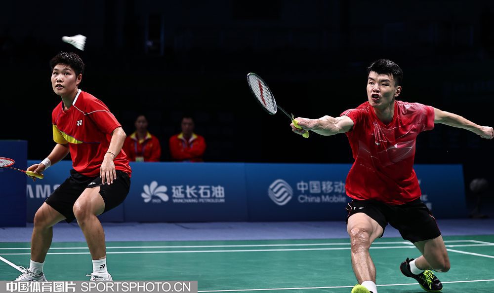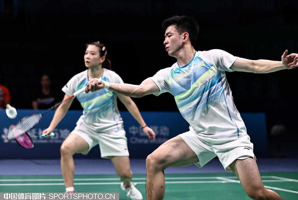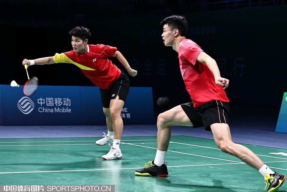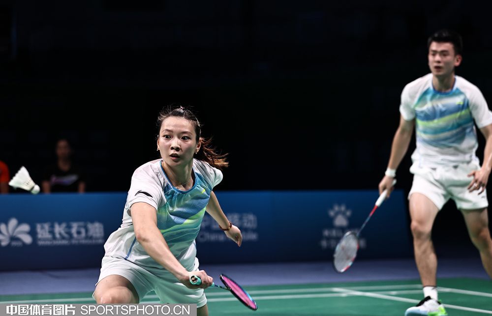 9月17日,在西安举行的第十四届全运会羽毛球混双决赛中,联合队的王懿律/黄东萍2比1击败浙江队郑思维/黄雅琼,夺得冠军。此前的东京奥运会决赛也是这两对组合的较量,王懿律/黄东萍取胜。图为郑思维/黄雅琼在比赛中。(中国体育图片 王宪民 摄)