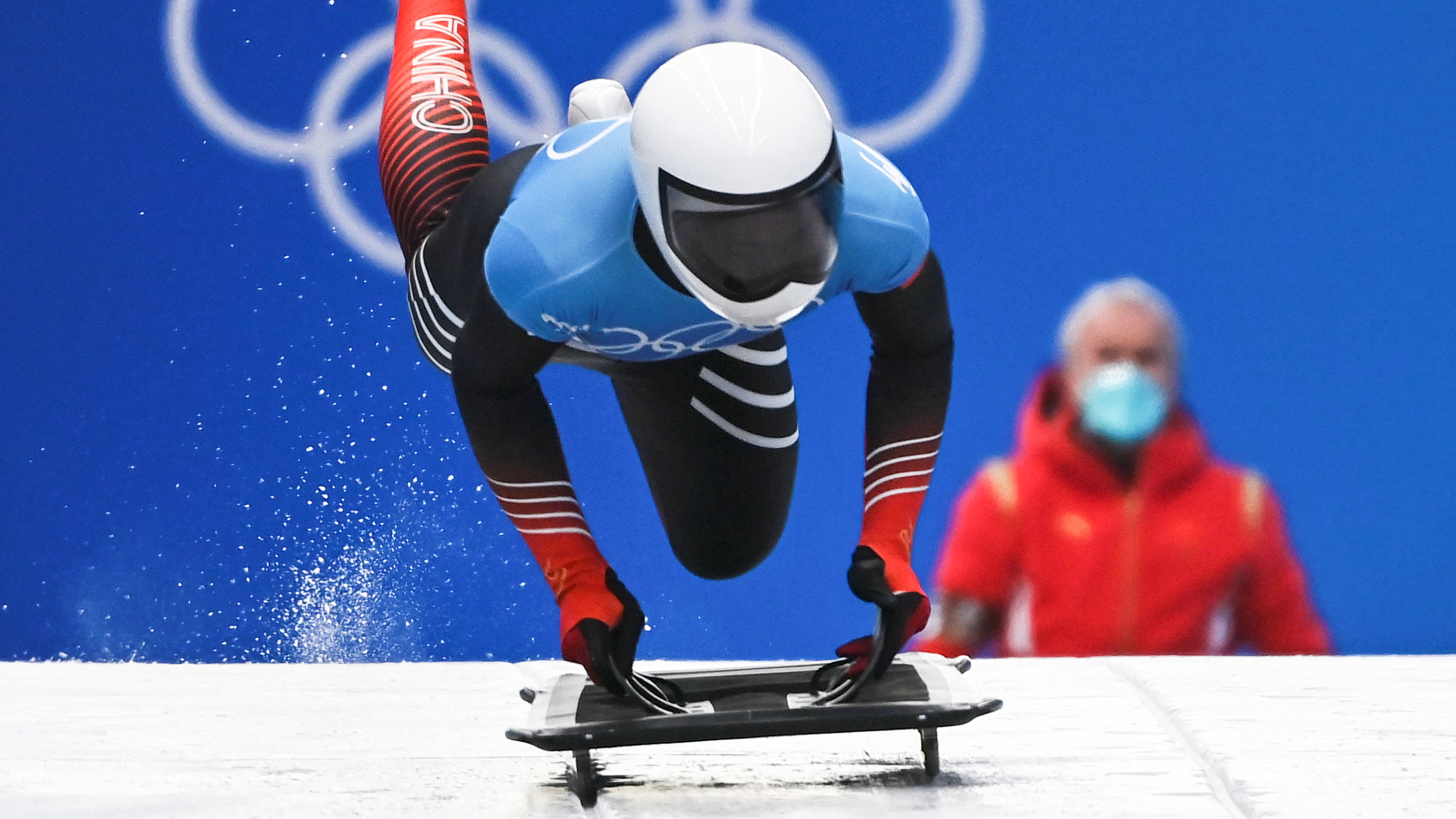 2月10日上午,北京冬奥会男子钢架雪车比赛结束前两轮争夺,中国选手闫文港、殷正分别以2分01秒08、以2分01秒45的成绩暂时排名第3和第7。图为殷正在比赛中。(图片来源:新华社)