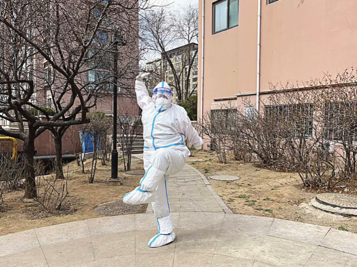 黄永存的主业是在武馆教授青少年武术,由于青岛疫情,课程停了,但作为社会体育指导员,作为志愿服务的践行者,黄永存主动和社区联系,脱下武术服,穿上防护服,在当地国学园社区做核酸检测的信息录入工作。