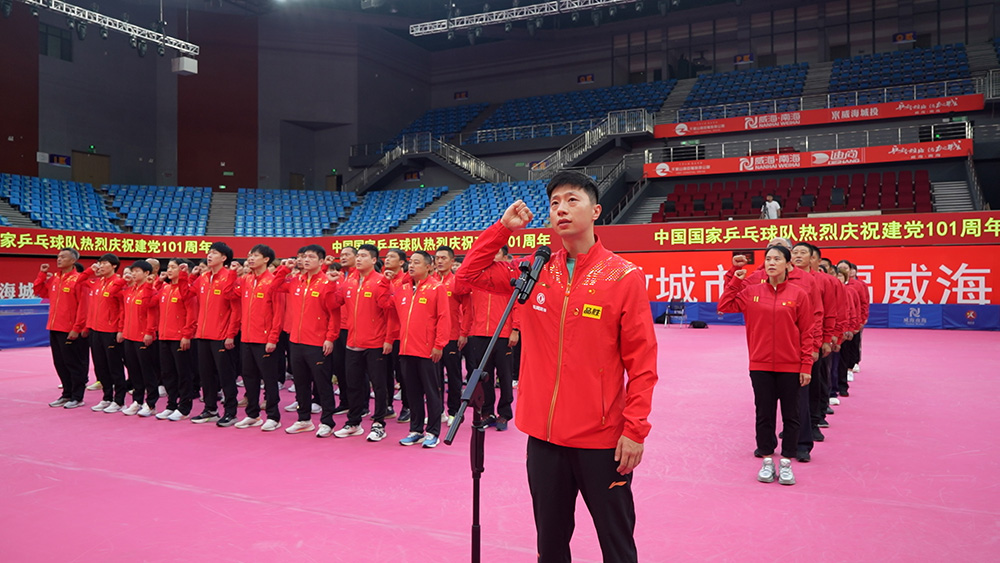 目前,中国乒乓球队正在山东威海集训,积极备战7月中旬在匈牙利首都布达佩斯举行的世界乒乓球职业大联盟WTT欧洲夏季系列赛。7月1日,全体在威海集训的运动员、教练员参加了中国乒乓球队党支部组织的庆祝中国共产党成立101周年活动。