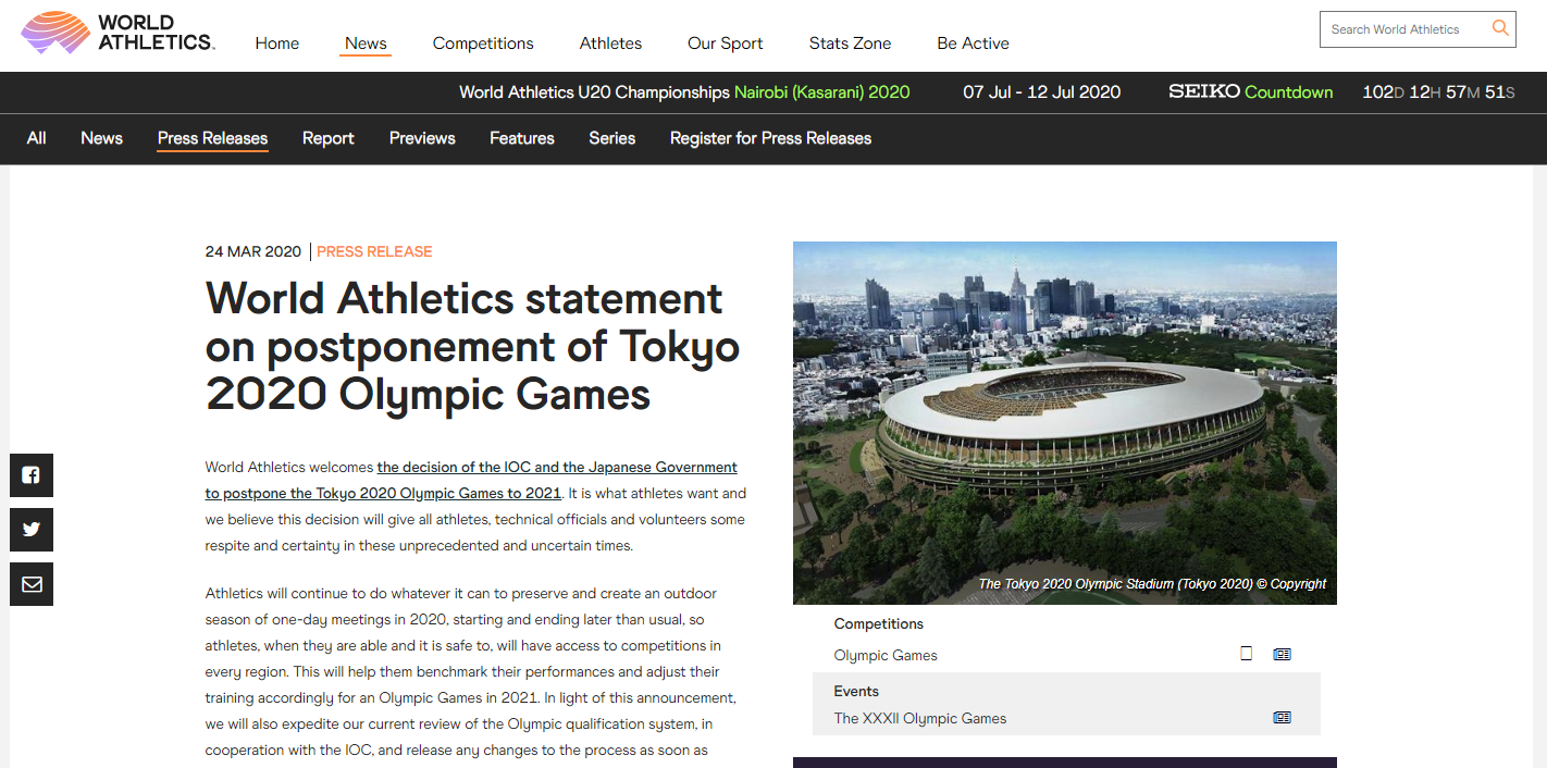 世界田联3月24日在官网发表声明,表示支持推迟东京奥运会,并已着手与2021年田径世锦赛组委会协商更改比赛日期为奥运会“让路”的方案,其中将世锦赛推迟到2022年是备选方案之一。世界田联表示,将尽快对目前的东京奥运会参赛标准和达标时限进行调整和发布,以帮助运动员更好地为2021年举行的奥运会做好准备。
