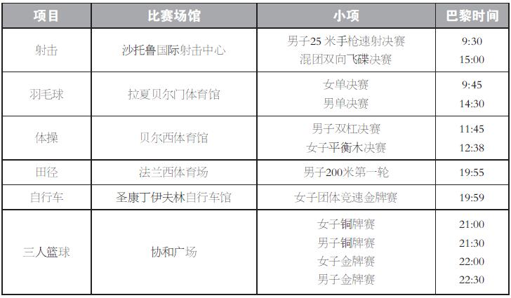 羽毛球男子双打决赛将战,期待这一天世界排名第一的中国组合梁伟铿/王昶将能够站在决赛场上,向着金牌发起冲击。击剑将迎来男子花剑团体决赛,重回见证中国队夺得世锦赛冠军的故地,期待巴黎大皇宫再次见证中国男花的新辉煌。游泳方面,中国队将向着男子、女子4×100米混合泳接力奖牌甚至金牌发起冲击。
