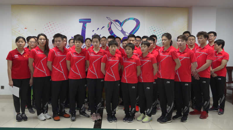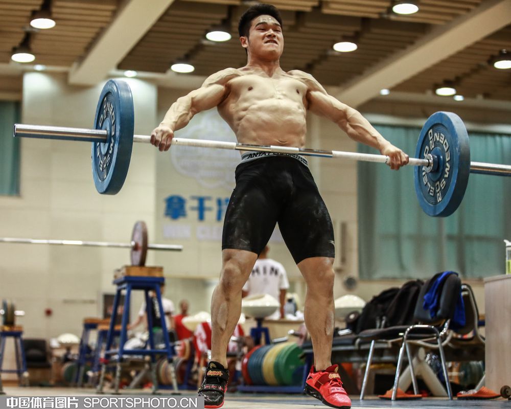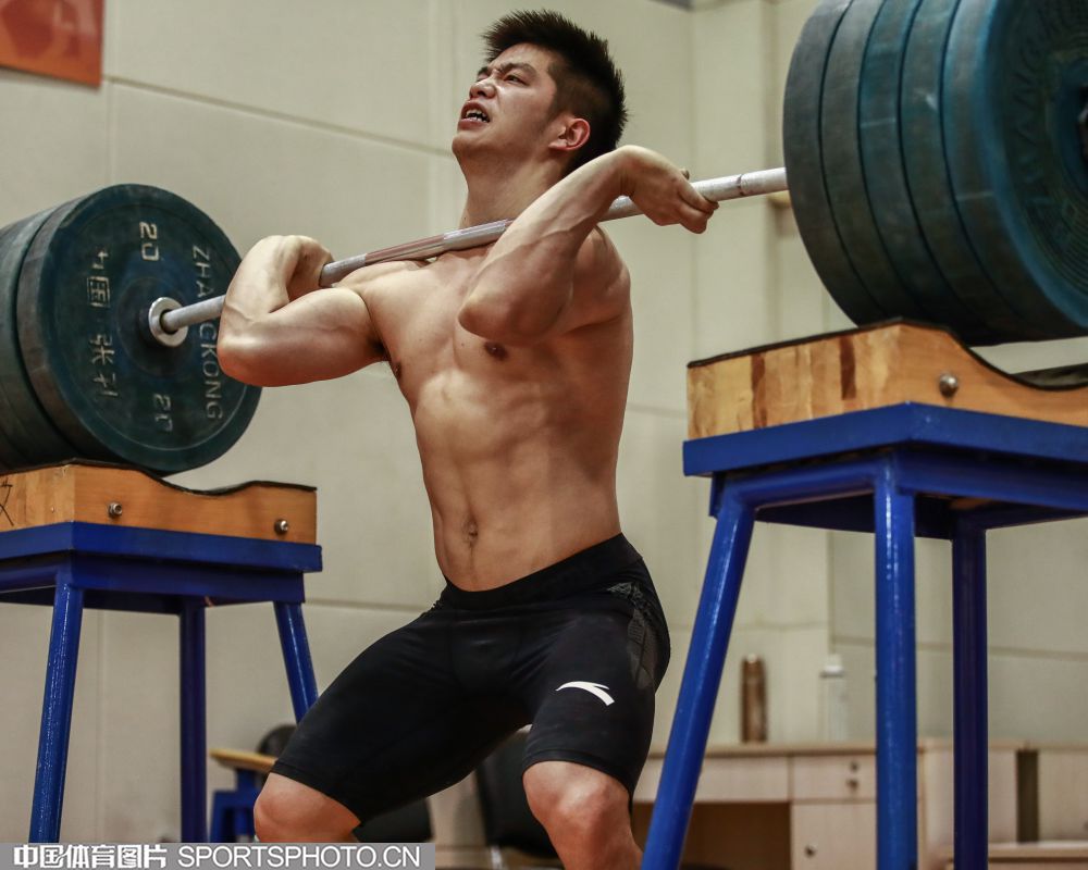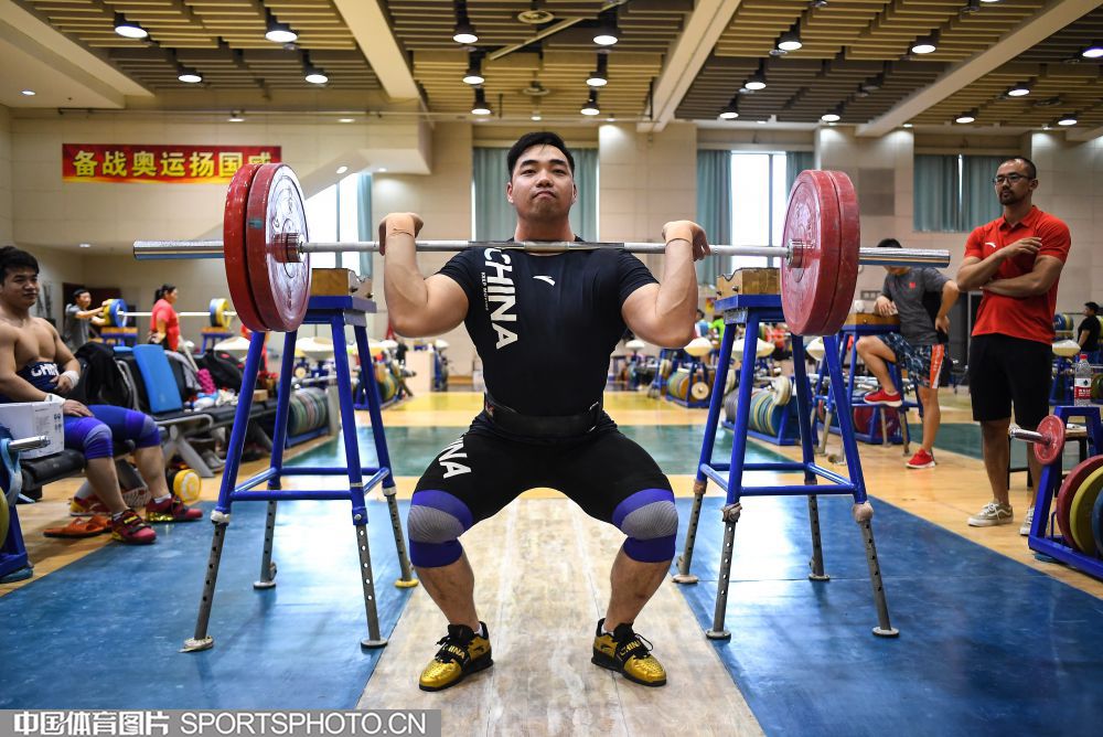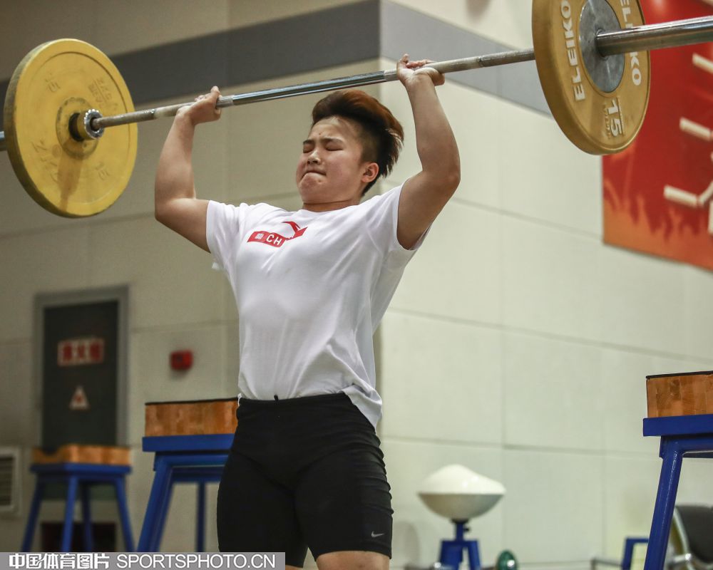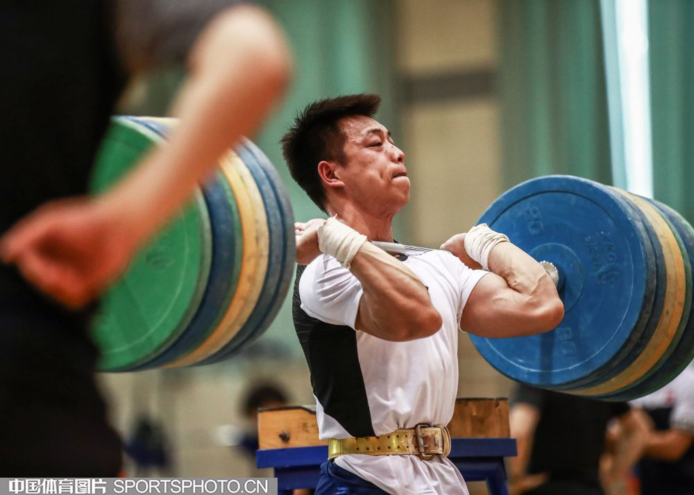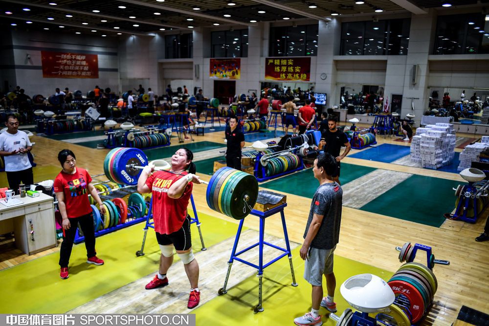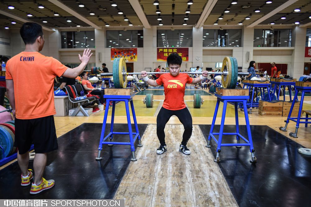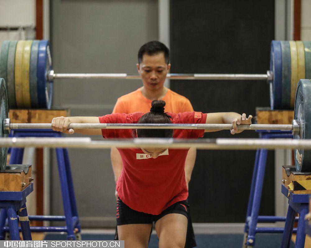 2019年6月25日,中国举重队在北京国家体育总局训练局举重馆训练,备战东京奥运会。为教练吴美锦帮助指导队员训练。