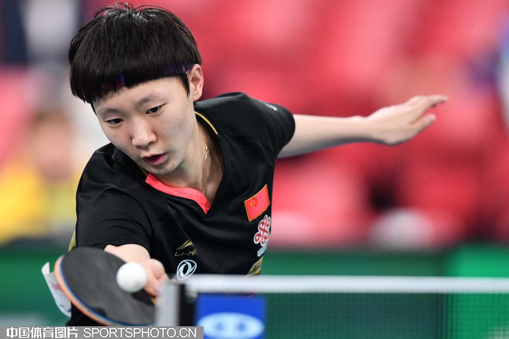 北京时间11月6日,2019国际乒联团体世界杯比赛在日本东京体育馆进行,在女团A组第二场比赛中,中国队3比0击败乌克兰队。图为王曼昱在单打比赛中。(中国体育图片 白宇 摄)