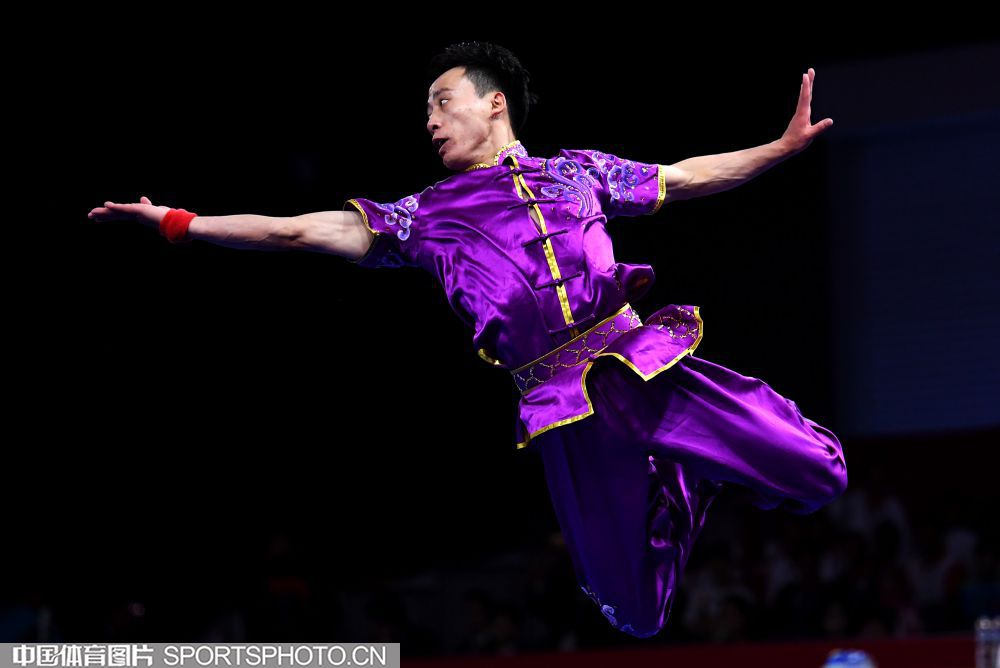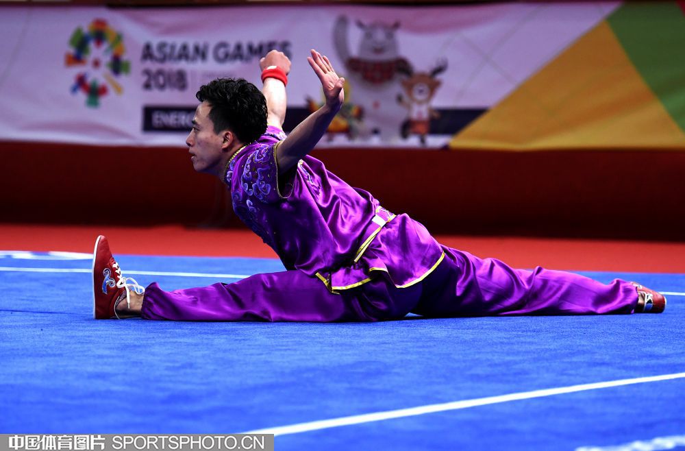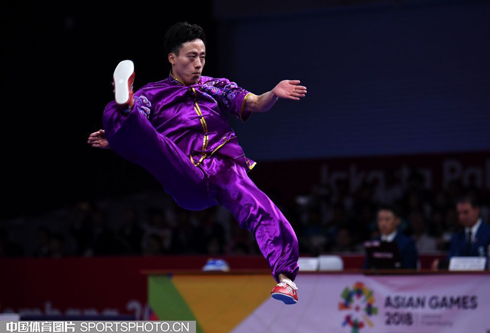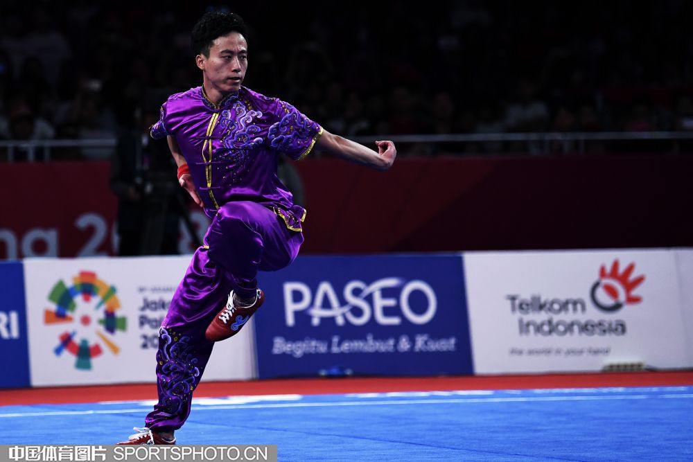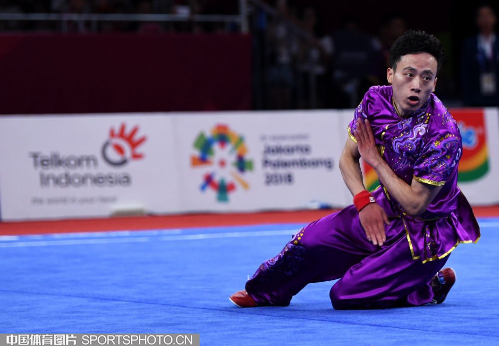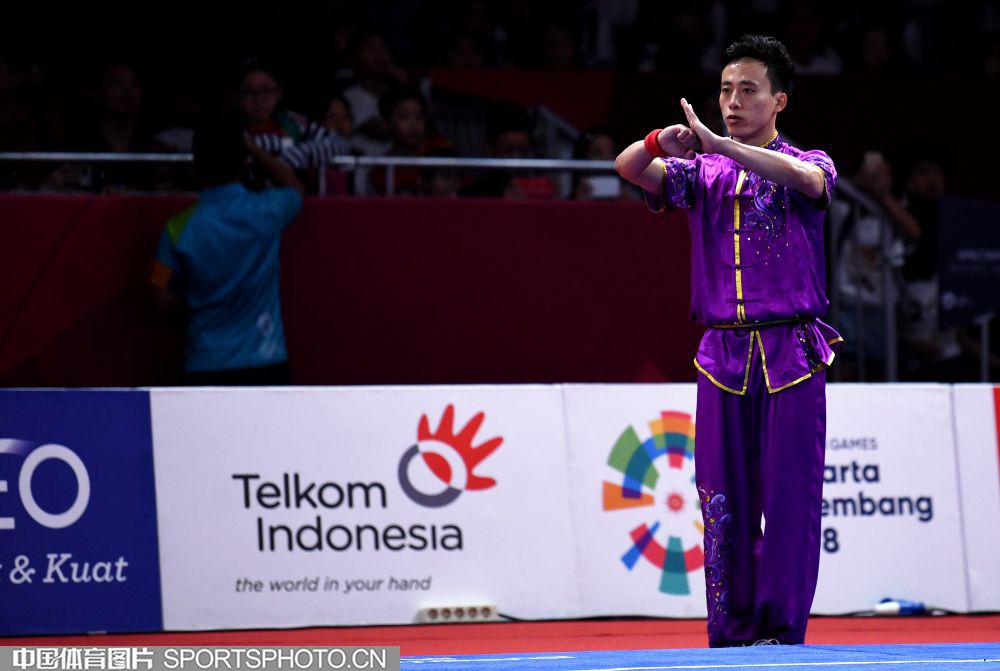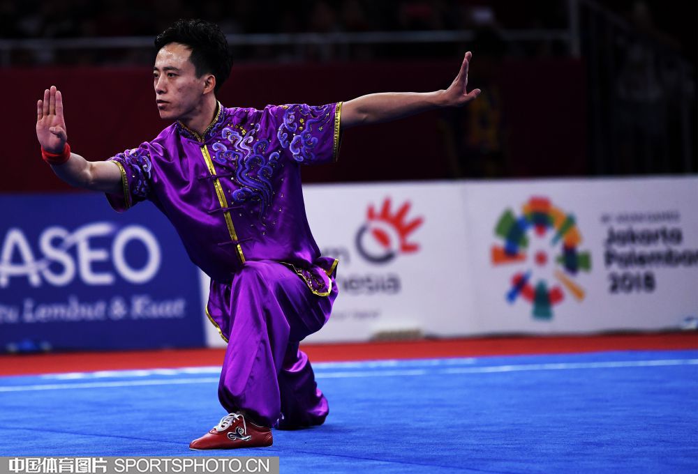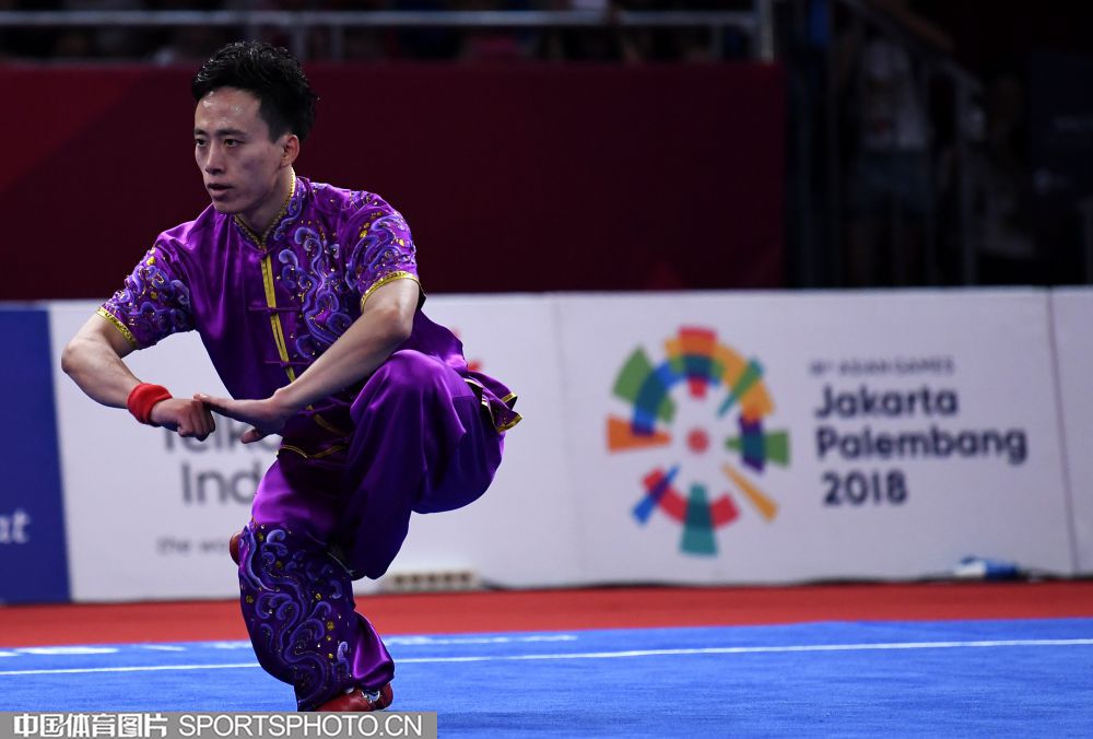 8月19日上午结束的武术男子长拳比赛中,中国老将孙培原以9.75分获得冠军,成功帮助中国队实现了亚运赛场首金“五连冠”。图为孙培原在比赛中。